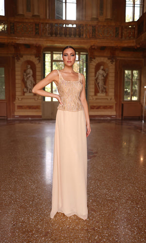 Sparkly crystal or bead embellishment that lend the perfect amount of sparkle for your formal evening dress