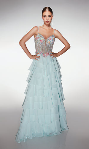 Gowns with lace are considered a timeless, feminine fabric used in the world of special occasions or as lace wedding dresses because there are so many ways to wear it. Lace formal dresses look stunning with both chunky beading as well as light and ethereal sparkle for long and short prom dresses. Lace is a delicate fabric due to its see-through and intricately embroidered patterns; if thick enough, lace’s structure will hide all your body flaws and sins. Soft, stretchy lace is used for long or short lace body con styles and homecoming dresses. ALYCE Paris has the perfect lace prom dresses.