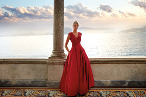 This 2023 super trend features a deep “V” shape down the chest and can be either demure or deeply cut. V necks are increasingly popular with A-line silhouettes, as they add drama and sexiness to the overall dress style, and sometimes covered with illusion fabric so there’s no need to worry about a fashion malfunction. This very trendy and sometimes sexy evening gown is especially flattering on petites to elongate their torso.
