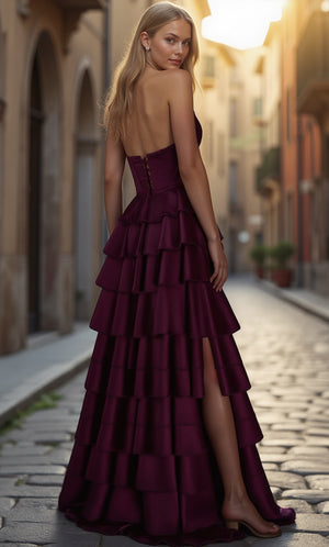 Show a little leg with an eye catching high slit, open split or folded-over slit in long dresses or prom gowns. Sexy prom dresses with slits work best on long prom dresses and ball gowns. Any body type that is comfortable with a showing can wear formal dresses with heart-stopping high slits - especially a red dress with slit.