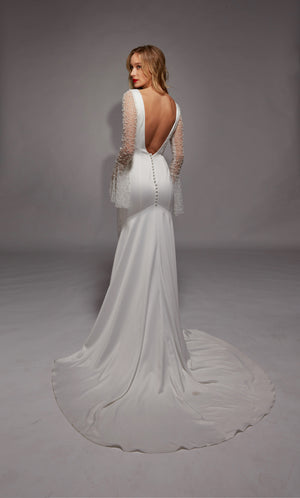 Extra fabric at the back hem that sweeps dramatically behind you. Trains are available in many lengths, and can easily be cut down or altered to your desired length. Trains are particularly desirable on bridal dresses.