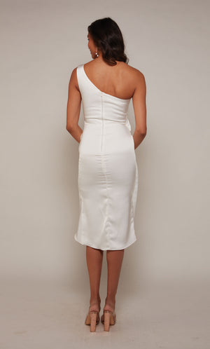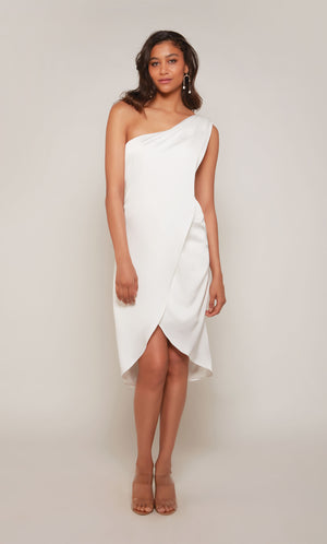 Asymmetrical single strap dress style that exudes a confident, unique goddess vibe and draws attention to your beautiful face and arms. Girls who wear one shoulder prom gowns and cocktail dresses can dance the night away knowing that no wardrobe malfunction will give them a time out on their special occasion. One shoulders are also great for knee length dresses and bridesmaid dresses because they can be dressed up as a formal gown or as a semi formal depending on the right high heels and jewelry.